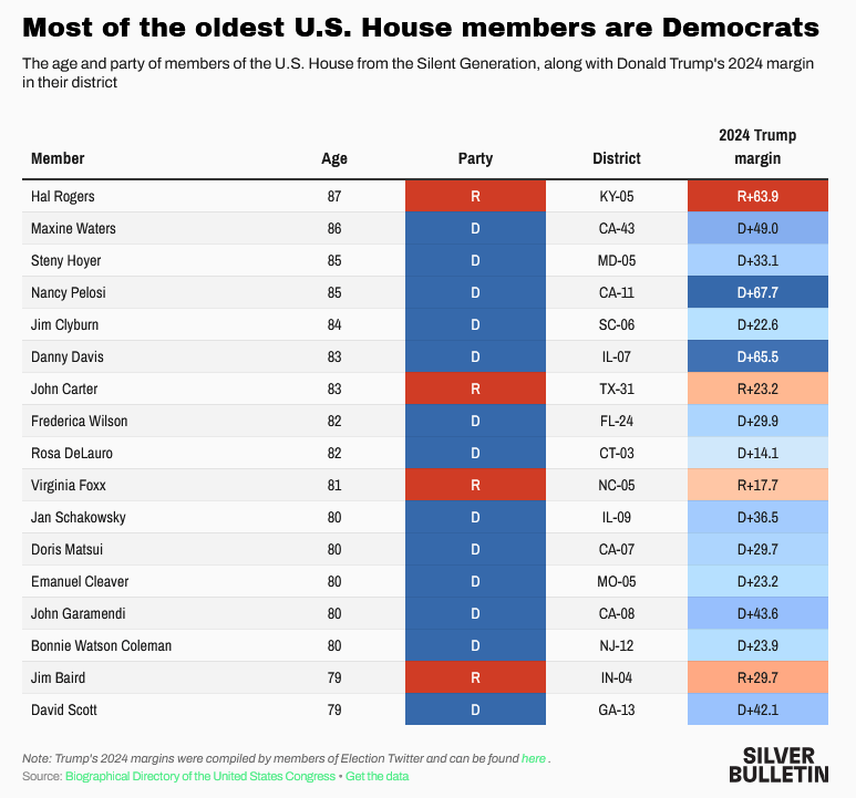 The Democratic Party of 2025 is facing the terrain of 2017, but with the toolset of 2014. The bench has evaporated, and the issue set on which Democrats align most with voters is opposition to Trump and Musk. The oldest members of Congress are almost all Democrats: